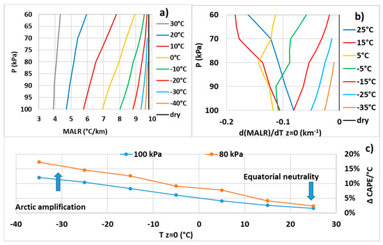 (a) MALR for various temperatures . The dry adiabatic lapse rate is also represented. (b) The derivative of the MALR with respect to . (c) Minimum increase in the differential of CAPE at two altitudes, which results from a 1 °C increase in .
