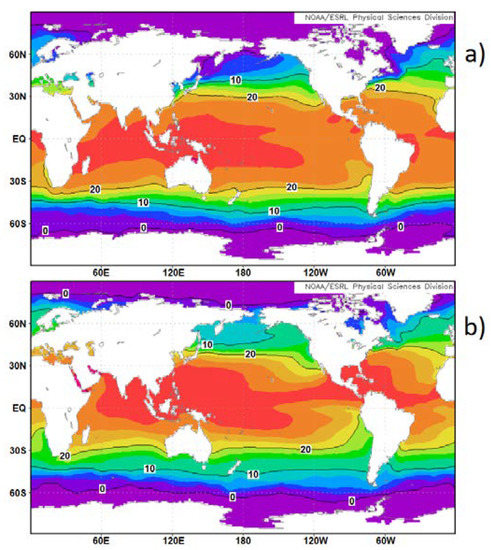 Monthly SST (°C) time-averaged over 1981-2010, in January (a) and July (b). Like in Figure 5 these are the months for which temperatures are extreme in each of the hemispheres (Maps provided by NOAA).