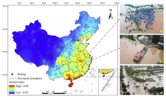 The central panel shows the flood hazard index over China (after [25]). (a) Submerged neighborhood in Jiangxi province (credits: REUTERS); (b) high water level rise in Changsha, Hunan province (credits: Xinhua); and (c) Dajing city, Zhejiang province under floods, August 2019 (credits: VCG).