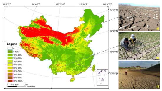 China is included within the monsoon zone with a varied and complex setting and terrain. Global climate change has influenced China’s temporal and spatial water and heat dissemination, leading to variation in biogeochemistry cycles. Climate change has altered the seasonal variation in atmospheric circulation-controlled precipitation [38,39]. Climate change has increasingly affected dryness, as well as contributes to the extreme rainfall shortage, more and more, which has become more severe due to anthropogenic pressures [40,41]. For example, North China’s droughts in 2009 affected 157 million acres of farmland, and the extreme dryness in Southwest China between 2009 and 2010 reduced bread-basket production to 120 million acres. Droughts each year have affected about one-sixth of China’s cultivated land, causing severe loss of grain. The drought-induced crop output decline is estimated to be around 1500–2500 million tons every year, representing approximately 4–8% of grain production and over 55% of total natural catastrophe losses in China.