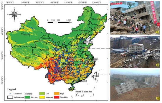 The central panel shows hazard landslides map over China. (a) Massive landslide in Zhouqu on August 12, 2010, in northwest China’s Gansu province destroyed several houses and many people died (credits: FREDERIC J. BROWN/AFP/Getty Images); (b) residential buildings collapsed during a landslide in Xiangning county in Shanxi province (credits: Handout); and (c) buildings collapse during a landslide in Shenzhen, Guangdong province (credits: REUTERS).