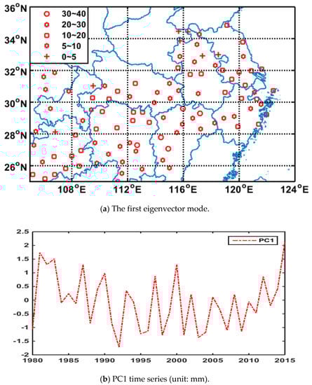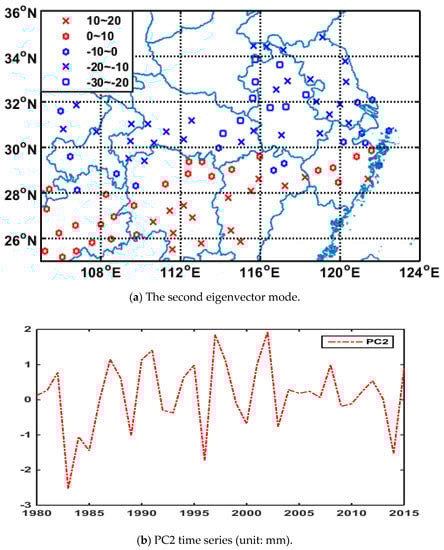 Changes in precipitation can indicate variations in the hydrological cycle on regional or global scale []. To evaluate the main characteristics of the AP variability over the MLYRB from 1980 to 2015, we employed an EOF analysis on the seasonal rainfall anomalies using data from the 97 observational stations over the MLYRB. Here, we focused on the two leading modes, which show distinct interannual variability patterns. A rule of thumb (North et al. []) was used to assess the degree of degeneracy among EOF modes.