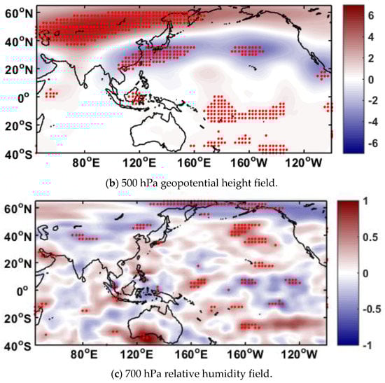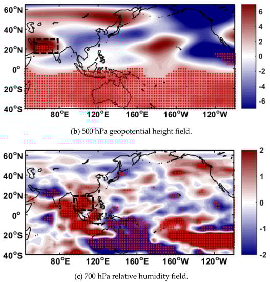 (3) In the mechanism analysis section, monthly gridded data of 500 hPa geopotential height, 850 hPa wind horizontal components, and 700 hPa relative humidity were analyzed with a resolution of 2.5° * 2.5° from the National Centers for Environmental Prediction (NCEP) reanalysis dataset [] for the period 1980–2015. We need to highlight that we computed the seasonal anomalies for reanalysis.