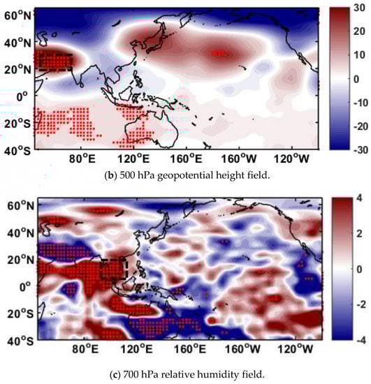 To further verify the usefulness of the NIF, this section evaluates the two most significant climate indices related to PC1 variability (EWI, TIOD) by computing the linear regression between these indices and different dynamic and thermodynamic variables affecting China AP []. For comparison, similar regression analysis is also employed using the AECC index that showed weakest association with PC1. Regression coefficients are calculated using time-lagged anomalies with summer indices defined as predictors and AP as the predicted variable. In this article, we use the F test to test the significance of the regression coefficients. The F test is a test of the goodness of fit of the entire model, that is, the significance test of all variables to the explanatory variables []. Figure 4, Figure 5 and Figure 6 show the variations in the regressed fields of the 700 hPa relative humidity, 850 hPa atmospheric circulation, and 500 hPa geopotential height with respect to the different climate indices. All of these regressed fields also support the conclusions provided by the NIF. As shown in Figure 4, due to the anomalous east-west distribution of the tropical Pacific SST, a strong westward airflow was stimulated over the tropical Pacific, and an easterly airflow occurred in the Indian Ocean at 850 hPa. After the eastward airflow crossed the Indo-China Peninsula, the airflow turned into a southwestern airstream and entered southwestern China (the dashed squares in Figure 4a and Figure 5a). Furthermore, a large-scale anomalous southwesterly airflow over East China is observed. The 700 hPa relative humidity anomalies over the Indo-China Peninsula and Philippines (the dashed squares in Figure 4c and Figure 5c) are verified to be most likely related to the 850 hPa atmospheric circulation anomalies. These mechanisms are relevant to produce AP anomalies over the MLYRB, especially in the southern region, which is in good agreement with the spatial distribution of the first EOF mode. In Figure 5, an easterly airflow was stimulated mainly over the tropical Indian Ocean owing to the TIOD. This easterly airflow was deflected to the north over the Indian Peninsula and then developed eastward, modulating a southwestern anomalous airflow over East China. Geopotential height anomalies were also enhanced in the India-Burma trough (the dashed squares in Figure 4b and Figure 5b), but it must be highlighted that this field passed only the 90% confidence interval test and not the 95% confidence interval test. In Figure 6, the relative humidity and circulation fields showed weak regression coefficients, indicating that AECC has a negligible effect in modulating the first EOF mode. This finding is consistent with results presented in Table 3. Therefore, the proposed NIF assessment can accurately reveal the most important climate drivers affecting the leading mode of AP variability over the MLYRB.