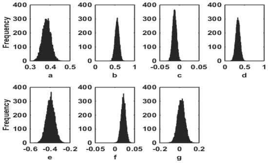 Figure 7 Histograms of the BLR parameters of PC2 that map all uncertainty onto the parameter space ((a–g) refer to each regression coefficient).