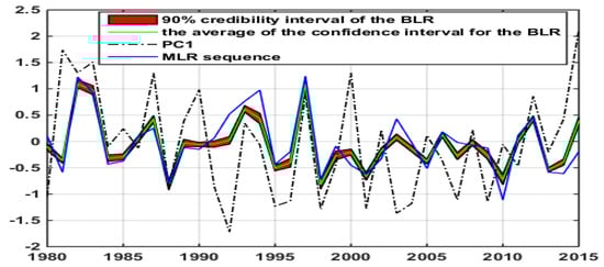 Comparison among the BLR-predicted results, the MLR sequence and PC1 (the red area represents a 90% confidence interval of the BLR model, and the thick green solid line is the average of the confidence interval for BLR).