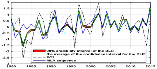 Comparison among the BLR-predicted results, the multiple linear regression (MLR) sequence and PC2 (the red area represents the 90% confidence interval of the BLR model, and the green thick solid line is the average of the confidence interval for BLR).