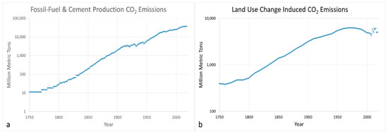 (a) Global CO2 emissions into the environment from fossil fuel consumption and cement production [7,8], (b) global CO2 emissions from land-use changes [9,10].
