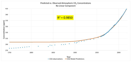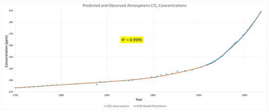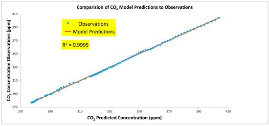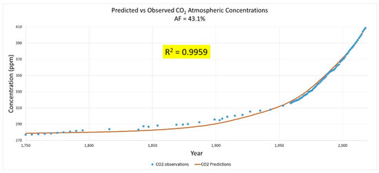 An analysis of the statistical validity of the fit of the semi-empirical model [Equation (2)] to the measured data was performed [see Supplementary Material] using Anova in Microsoft Excel [35]. A linear regression of the predicted atmospheric CO2 values versus the measured CO2 levels yields the results shown in Figure 9. The slope of 1.008 (R-square: 0.9995) demonstrates almost a perfect fit with a robust statistically significant relationship (p-value: 3.2E-140). This result provides strong statistical evidence that AFFF has been unchanged at 51.3 ± 0.4% (95% confidence interval) for the entire analysis period of 268 years.