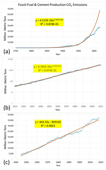 (a) Comparison of best fit exponential growth curve with fossil fuel and cement production CO2 emissions (1750–2018). (b) Comparison of best fit exponential growth curve with fossil fuel and cement production CO2 emissions (1810–1910). (c) Comparison of best fit linear growth curve with fossil fuel and cement production CO2 emissions (1945–2018).
