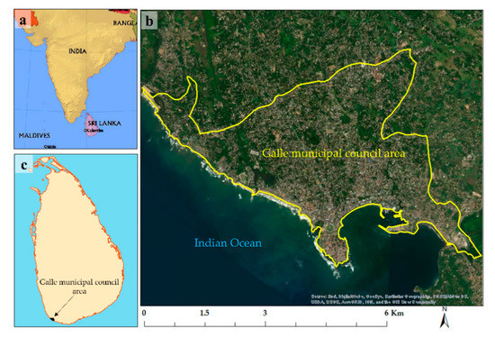 The seaside city of Galle is bordered by the Indian Ocean from south and southwest, and is the provincial capital city of the Southern province, Sri Lanka. It is located in the down south coast 116 km away from Colombo [32]. From the biophysical aspect, agroclimatic regain of the city goes within the wet zone. Moreover, the city experiences a monsoon distribution of rainfall, which receives 2377.9 mm per year [32]. The average daytime ambient temperature is 26.7 °C [32], while humidity ranges from 80% to 88% [32]. Excluding a few isolated hills, which are around 60–160 feet, other areas are lowland, including marshes and water bodies.