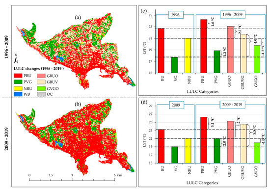 LST variation and its different contribution by LULC categories: (a) LULC changes from 1996 to 2009, (b) LULC changes from 2009 to 2019, (c) LST variations on changes land from 1996 to 2009 and its temporal comparison with 1996, and (d) LST variations on changes land from 2009 to 2019 and its temporal comparison with 2009. PBU, persistent built-up; PVG, persistent vegetation; NBU, non-built-up; WB, waterbody; GBUO, gain of built-up from others; GBUVG, gain of built-up from vegetation; GVGO, gain of vegetation from others; OC, other changes; BU, built-up; VG, vegetation.