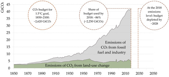 Climate change continues to challenge conventional fossil-based development pathways. That governments across the world have begun to understand this challenge is reflected in the 2015 United Nations (UN) Paris Agreement to hold global warming well below 2 °C and to strive to limit it to 1.5 °C [1]. Hilaire et al. [2] note that the ‘[f]ast dwindling carbon budgets’ (p. 190) for the temperature goal of the Paris Agreement first and foremost requires a rapid decarbonisation of the global energy system. Notwithstanding large decarbonisation efforts, meeting the temperature goal is also likely to require large-scale deployment of complementary solutions in the form of negative emissions technologies (NETs) [2,3]. The Intergovernmental Panel on Climate Change (IPCC) estimates that the carbon budget for the 1.5 °C is likely to be depleted by the end of the 2020s [4] (Figure 1).