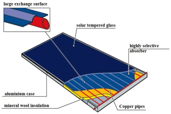 Global solar radiations have a direct radiation component and a diffused radiation component. When comparing these two, the direct radiation component has a more effective solar thermal energy intensity value compared to that of the diffused radiation component. Therefore, a higher value of the direct radiation component results in a larger value of useful energy harnessed by the solar collector [41]. In this paper, the plate is made of copper or steel to ensure good thermal conductivity and the surface is treated with dark and opaque material to reduce reflection and increase absorption. This surface must have a high degree of absorption of the short waves of radiation and a low degree of emission of the long waves, mainly infrared, emitted by the plate at its operating temperature. To guarantee a good thermal contact between the capturing surface and the bundle of pipes in which the heat carrier fluid flows and to minimize the thermal resistance between the two structures, they are welded together. The captive plate is interposed between the transparent front cover and an insulated casing. In this way, it limits the heat dispersions linked to the thermal radiation emitted by the plate itself and favors the increase in temperature of the circulating fluid. The insulated case’s aim is to achieve thermal insulation of the bottom and lateral walls of the collector, to minimize losses by conduction. To limit the condensation due to humid air, an aluminum sheet is placed on the insulation plate, while the collector is placed in stainless steel wrap, anodized aluminum, or fiberglass to give compactness and mechanical solidity and to protect the various components from atmospheric agents and dust.