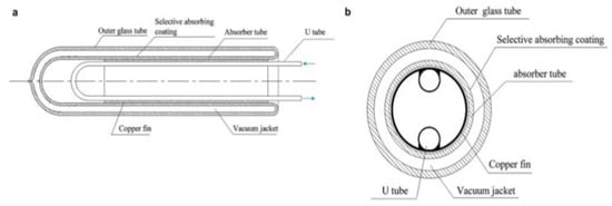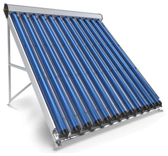 The evacuated-tube collector is one that guarantees a high efficiency ratio while in the low intensity of solar radiation areas. Specifically, its main feature is the absence of an air gap between the glass surface and the capturing surface, which significantly reduces the amount of heat dispersed by convection and ensures a more stable efficiency curve. However, these types of collectors are more complex. As seen in Figure 2, the vacuum collectors are composed of a series of glass tubes arranged parallel to each other.