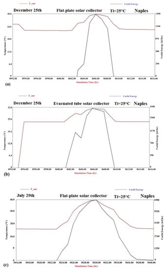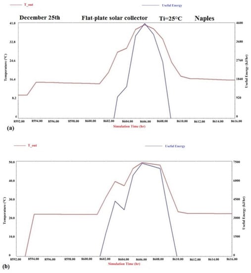 In Figure 14, the daily outlet temperature and useful power registered for 25 December and 29 July, in the string of four (a) flat-plate and (b) evacuated-tube collectors placed in the city of Naples when Ti = 25 °C, are plotted.