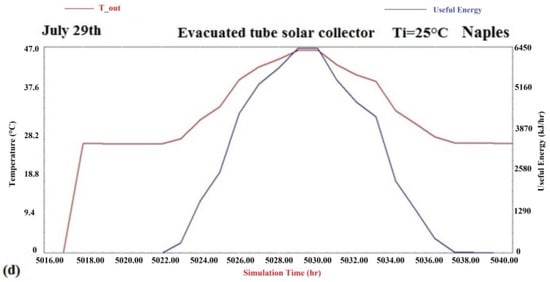 In Figure 10, the daily outlet temperature and useful power registered for 25 December and 29 July, in (a) flat-plate and (b) evacuated-tube collectors placed in the city of Naples when Ti = 25 °C, are plotted. On 25 December, in Naples, the flat-plate collector reports 30 °C as maximum outlet temperature, whereas the registered Qmax is 1450 kJ/hr.
