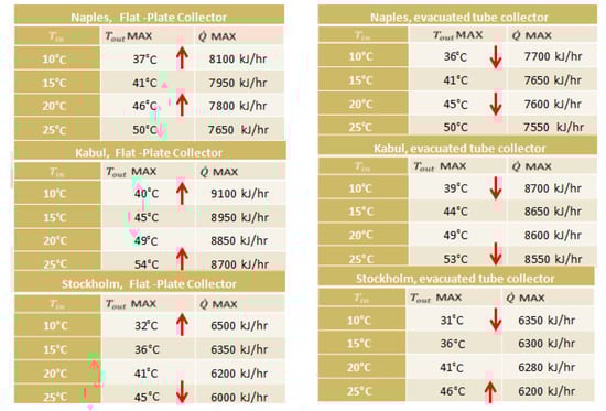 Figure 15 shows the predicted values of maximum outlet temperature and useful power peak. It can be seen that four ETCs deliver more power at 107 °C in Naples, at 118 °C in Kabul, and at 90 °C in Stockholm. Hence, it can be concluded that the ETC is the best selection for climatic conditions prevailing in Naples (Italy), Kabul (Afghanistan), and Stockholm (Sweden).