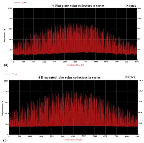 Figure 8 shows the outlet temperatures for the (a) flat-plate and (b) evacuated-tube collectors placed in Naples during a whole year (8760 h from 1 January to 31 December), when the collector inlet temperature is 25 °C.