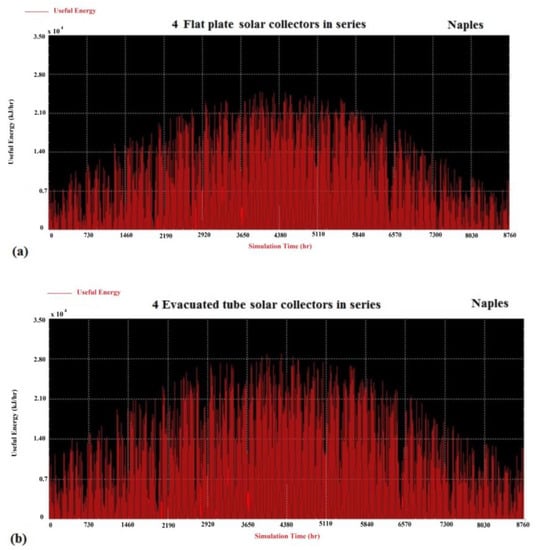 In Figure 9, the one-year useful power given by (a) flat-plate and (b) evacuated-tube collectors placed in the city of Naples when Tin = 25 °C is plotted.