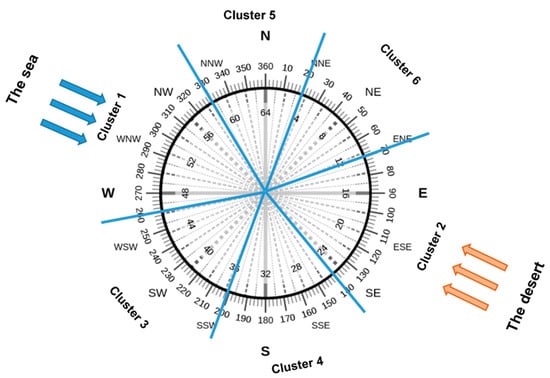 Clustering techniques were used to investigate the level of correlation between the microclimate parameters, i.e., air temperature and wind speed, monitored in the urban and suburban locations, and the canopy UHI intensity under the different ranges of wind directions. The cluster analysis was performed in the MS Excel tool only for the urban and suburban locations because those are the areas where the urbanization may produce an impact on the UHI intensity, while the rural area was considered as the reference location for the calculation of the UHI intensity. The data collected by each meteorological station for the entire period of interest (i.e., 5 years) were divided into six clusters based on the directions of the wind (i.e., either from the seaside or from the desert side, or from the coastal side which is in between, and divided according to four wind direction ranges). The characteristics of the six clusters are summarized in Table 2 and Figure 2.