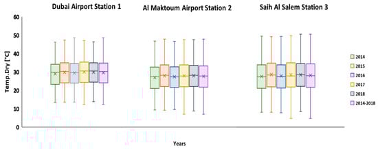 Box plot of the air temperature for the urban, suburban, and rural areas in Dubai for 5 years (i.e., 2014–2018).