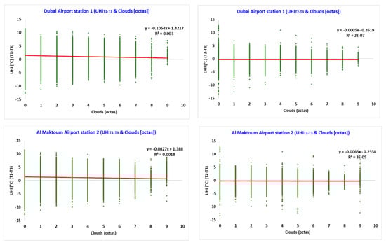 Comparison between the urban heat island (UHI) and the cloud cover relation: UHI intensity T1–T3 and cloud cover from station 1 (top left), UHI intensity T2–T3 and cloud cover from station 1 (top right), UHI intensity T1–T3 and cloud cover from station 2 (bottom left), UHI intensity T2–T3 and cloud cover from station 2 (bottom right).