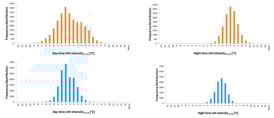 3.2. Daytime and Night-Time UHI Intensity and Frequency Distribution