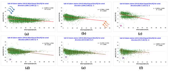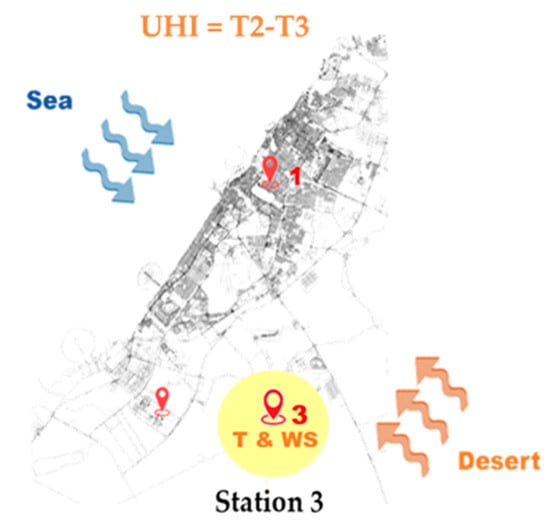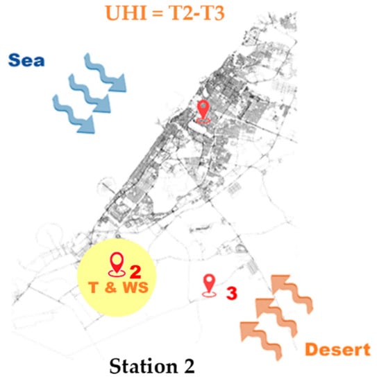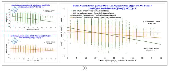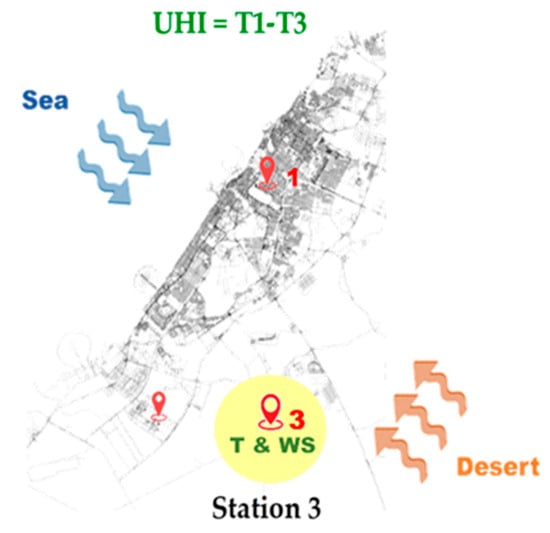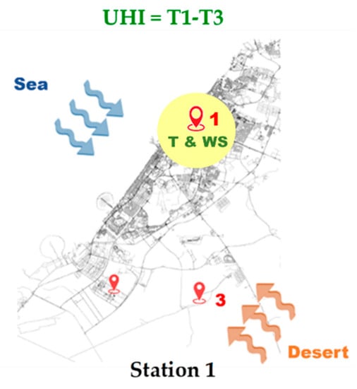 The data collected by reference station 3 (i.e., Saih Al Salem), which is located in a rural desert village far from the seacoast, show a moderate to a strong correlation between the UHI and the temperature and wind speed, for all wind directions. This is similar to the relation found in the studies of Ibadan and Sydney [2,47].