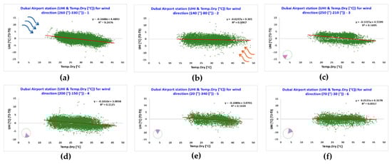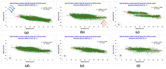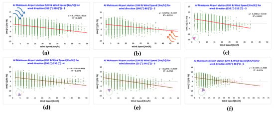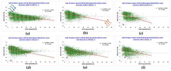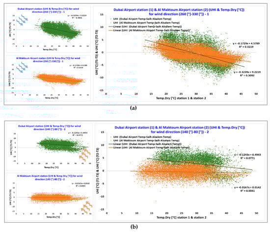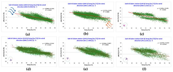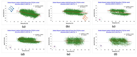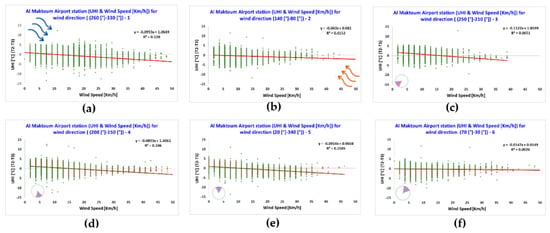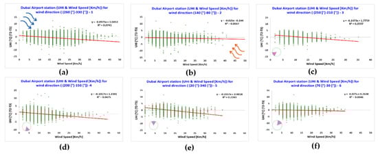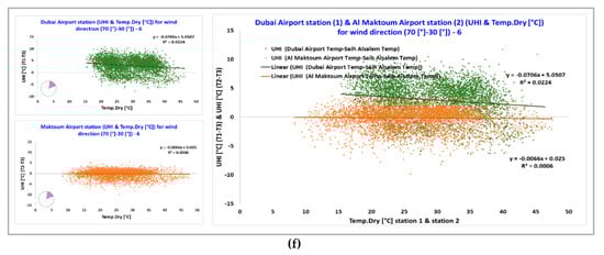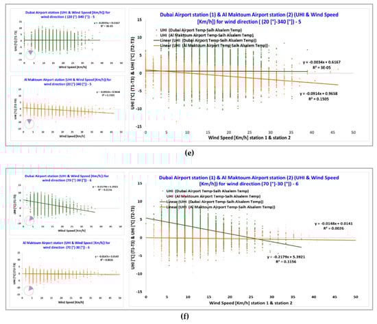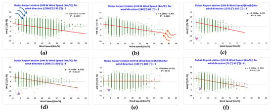 The air temperature and wind speed measured by station 1, located in the Dubai International Airport, were investigated for the six clusters of different ranges of wind direction in relation with the canopy urban heat island intensity (UHI) calculated as the difference between the air temperature measured at the Dubai International Airport (i.e., station 1) and at Saih Al Salem (i.e., station 3), where station 1 is considered as located in an urban area and station 3 is considered as located in a suburban area (Figure 7).