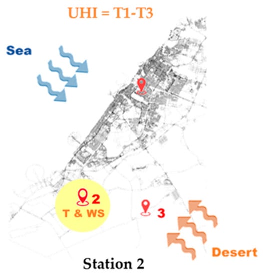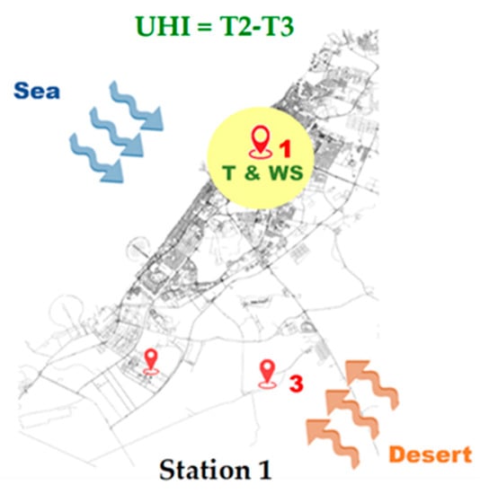 It was found that the temperature and wind speed results differed between the western (seaside) and eastern (desert side) parts of Dubai. The UHI intensity varies with the wind direction and meteorological conditions. Regarding the UHI intensity T1–T3, it was found that when the wind in the urban area was coming from the desert, the temperature and the UHI were almost independent. However, a relation exists when the wind is coming from the seaside (i.e., sea breeze). Therefore, the wind speed influences the UHI intensity depending on the synoptic climate conditions and wind directions. A reverse correlation was found between the wind speed and UHI intensity for all wind directions, except the North direction where no correlation was found in the urban area. In the suburban area, an inverse relation was observed between the wind speed and the magnitude of UHI, for all wind directions. At the same time, a moderate to strong correlation was found between the UHI and both temperature and wind speed for all wind directions in the rural area.