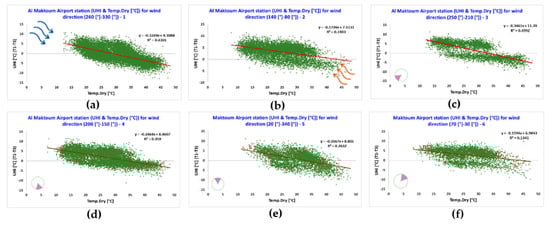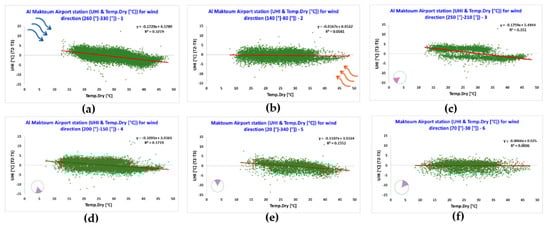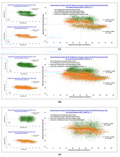 Figure 8 shows a comparison of the relation between the hourly canopy UHI intensity (UHI intensity T1–T3) and the hourly air temperature measured by station 1 under a different cluster of wind directions. A moderate negative correlation between the temperature and the UHI intensity was found for cluster 1 (i.e., wind direction between 260° and 330° from the seaside) (Figure 8a) where the UHI ranges between 11.5 °C and −12.8 °C, cluster 3 (i.e., wind direction between 250° and 210° from the coastal area) (Figure 8c) where the UHI ranges between 10.1 °C and −7.8 °C, and cluster 4 (i.e., wind direction between 200° and 150° from the desert) (Figure 8d) where the UHI ranges between 11.4 °C and −11.2 °C. The temperature for these three clusters fluctuates between 47 °C and 12.3 °C. A weak negative correlation between the temperature and UHI intensity was found for all the remaining clusters except for cluster 5 (i.e., wind direction located between 20° and 340°) (Figure 8e) where no correlation was found. The results show that the UHI intensity varies with different wind directions. When the wind is blowing from the desert (i.e., cluster 2) (Figure 8b), the temperature and the UHI are almost independent. Despite the positive impact of the sea breeze, coastal cities suffer from the UHI [41]. Different experimental and numerical investigations have shown the impact of the sea on the development of the UHI in coastal cities [42,43]. The temperature in station 1 is affected by UHI when the wind is blowing from the seaside. It seems that, when there is a sea breeze combined with high temperatures, the negative UHI value is high (Figure 8a). This is due to the fact that the high temperatures recorded by station 1 are mitigated by the sea breeze more than the temperatures recorded by rural station 3, which is closer to the desert and typically reaches higher temperatures during hot days. This pattern is due to advection from the sea breeze cooling mechanism and the flow of air, which is affected by buildings. These results align with those of similar studies in Athens and Sydney [2,7,44,45].