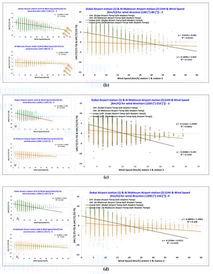 In the urban station (i.e., station 1), a reverse correlation between the wind speed and UHI was observed. For most wind directions, when the wind speed increased, the UHI decreased. However, when the wind is coming from the North, the correlation is close to zero. These results are consistent with the findings of previous studies that have examined the impact of wind speed on UHI magnitude in various areas such as Ibadan and Ulaanbaatar [3,47,48].
