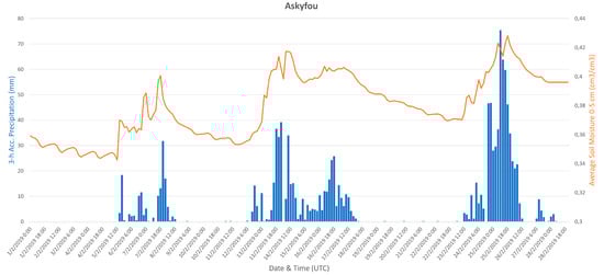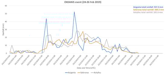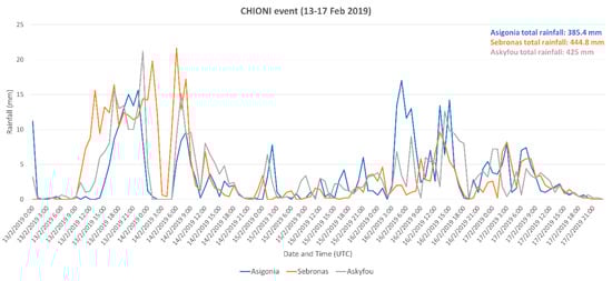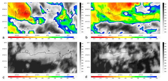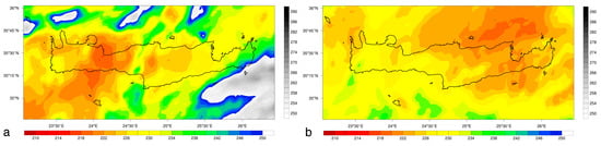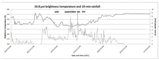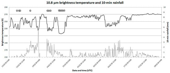 - Degree of blocking of the impinging flow: Thorough inspection of satellite imagery revealed that during the first phase of Chioni, embedded convective cells developed over western Crete. During the second phase of Chioni, the clouds and rainfall regime were almost purely stratiform. This is an indication of a flow that gradually evolves from neutral/slightly unstable conditions to stable conditions and therefore from unblocked to a more blocked flow. This feature is also supported by the day-to-day lightning activity over the island, as well as from the rainfall spikes evident in the surface observations depicted in Figure 12. During the second storm Oceanis, the flow was unblocked for a longer period of time, leading to a more convective nature of the rainfall regime, as also shown in the time evolution of cloud tops’ brightness temperature and the corresponding rainfall rates at the ground (see Figure 14). This unblocked flow finally generated higher accumulations of rainfall at the ground and at shorter time periods.