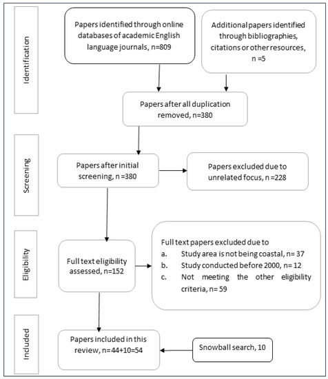A total of 809 articles were initially obtained for possible inclusion from the 3 databases, and these papers were assessed using the four major steps for selecting articles for a systematic review, i.e., identification, screening, eligibility and inclusion. Articles were initially screened to ensure their relevance to the study’s aims and objectives. Then the inclusion/exclusion criteria presented in Table 1 were used to assess the relevance of each article. After removing duplicated papers, we obtained 380 articles in the identification step. Then, in the screening step, 228 papers were excluded due to having an unrelated focus. Therefore, 152 papers were assessed for eligibility by studying their full text. In this eligibility step, 37 articles were excluded because the study area did not include coastal areas, and another 59 articles did not meet other eligibility criteria. In the final step, 44 papers were included, and after that, a snowball search was undertaken to include more articles and to find out if any relevant articles had been missed. A snowball search uses the reference list or citations in a paper to identify additional papers [25]. Snowball sampling is an effective method for identifying sources published in obscure journals that may be missed from common databases, although potentially onerous because the sample grows at an exponential rate [26]. In this study, articles cited within the set of articles were assessed for inclusion, with 10 found to meet the criteria. Therefore, finally, 54 full-text relevant articles were obtained and reviewed. A summary of the review protocol is shown in Figure 1.