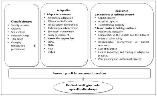Developing and implementing suitable adaptive strategies in agricultural practices to respond to climate change is essential worldwide. At the same time, in places like Bangladesh, understanding how adaptation links to development is also a key challenge. Therefore, scientific research that helps the nation build capacity to generate appropriate conceptualisation of information on climatic risks and adaptation opportunities at different scales is very important [8,9]. Bangladesh’s economic, social, environmental and climatic characteristics determine its climate change adaptation strategies and action plan. Academic research can help to explain relationships likely to affect the expected outcomes and to explain existing practices and direct possible future interventions for expected outcomes [10,11]. Hence, it is important to understand what coastal communities and governments in Bangladesh can do to take necessary action for adaption [12], and to what extent these adaptations can build resilience in the agricultural sector. A range of studies [13,14,15,16,17] have explored various aspects of climate change adaptation in coastal Bangladesh. Necessarily, these studies are focused on specific contexts or issues to be addressed. A synthesis of this knowledge could help create a more complete picture of coastal agricultural resilience in Bangladesh by summarising the progress made thus far and identifying the major gaps that need to be addressed.