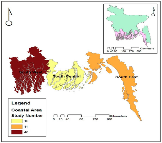 Among the identified articles, 37% used quantitative methods focusing on face to face interviews and focus group discussions (FGDs), 17% used qualitative research methods focusing on in-depth interview and key informant interviews, 33% used mixed research methods and 13% focused on reviews, which included published research materials and secondary data, such as data from the Bangladesh Bureau of Statistics (BBS). In addition, Figure 3 presents a map visualizing the number of studies focusing on each of the coastal regions of Bangladesh. We have categorized the coastal belt into three major coastal regions, i.e., South West, South Central and South East region. As shown in the map, around 70% of the studies were held in the South West regions of coastal Bangladesh (Figure 3), and within this region, research was undertaken in Satkhira, Sundarban, Mongla, Khulna, Bagerhat and Narail Districts. Among these districts, the majority of the studies’ locations were in the Satkhira District, whereas comparatively few studies (around 15% in each region) were held in the South Central and South East regions. The study areas within the South Central regions are Bhola, Patuakhali, Borguna and Pirojpur, and in the South East regions, the study areas are Noakhali, Chittagong, Cox’s Bazar and Hatia.