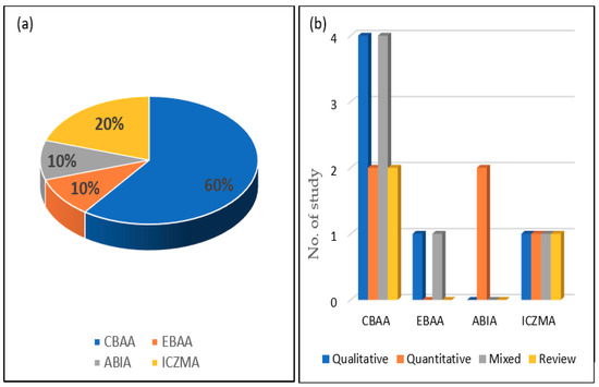 A variety of intervention approaches have been used or investigated in different studies (Table 3): A community-based adaptation approach (CBAA), integrated coastal zone management approaches (ICZMA), an ecosystem-based adaptation approach (EBAA), and an asset-based index approach (ABIA). More than half of the reviewed papers (60%) identified the CBAA intervention approach followed by ICZMA, EBAA and ABIA; 20%, 10% and 10%, respectively (Figure 4). In the CBAA approach, which focuses on livelihood improvement and understanding people’s behaviours and perceptions, qualitative and mixed research methods were the most common. In the EBAA intervention approach, which focuses on adaptability, ecological modernization and aquatic ecology, only qualitative and mixed methods were used. In the ABIA intervention approach, which covers economic analysis and production outcomes, only a quantitative research method was used for investigation. The ICZMA intervention, which focused on coastal afforestation and coastal policy implication used all four types of research methods for investigation (Figure 4).