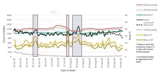 All-cause excess mortality in 65+ years group during the 2020 summer period. The shaded areas highlight periods which meet the Heatwave Plan for England (PHE) heatwave criteria for estimating heatwave excess mortality [23].