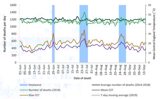 The temperatures for the summer periods in 2017, 2018 and 2019 demonstrate that the temperatures for 2019 were generally lower than 2017 and 2018, with short spikes for the heatwave periods and a significant spike for 25 July 2019 when the all-time highest recorded temperature of 38.7 °C was recorded (Figure 4) [17]. This correlates with the lower-than-usual excess deaths for the summer 2019 period.