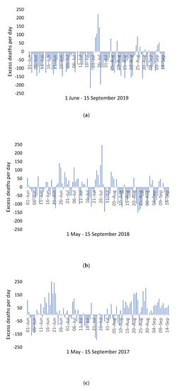 Daily excess deaths during the summer period (1 June to 15 September) for (a) 2017, (b) 2018 and (c) 2019 based on daily death occurrences. The negative excess deaths refer to days when death was lower than expected relative to the average of the previous 5-year period.