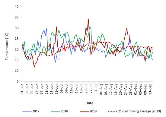 Maximum temperatures during the summer period (1 June to 15 September) for 2017, 2018 and 2019.
