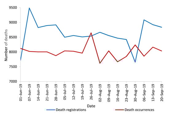 Daily death occurrences (red line) compared to death registrations (blue line) for the period 1 June to 15 September 2019.