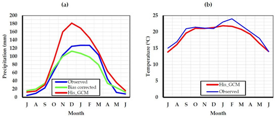 This section validates the performance of CORDEX-RCM current climate data for the period 1976–2005. Results presented in Figure 3a,b shows that ensemble monthly historical RCM after bias correction mostly agreed with the observed precipitation and temperature in the catchment. The agreement between the simulated RCM climate and the observed indicated that CORDEX-RCM data after bias correction were capable of projecting future climate.