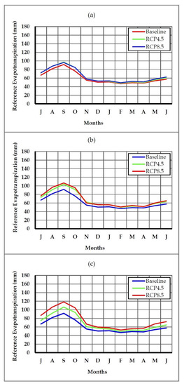 This study estimated reference crop evapotranspiration (ET0) using the Penman-Montieth equation. Projected changes in ET0 were calculated as the difference between the average monthly and annual ET0 for RCP 4.5 and RCP 8.5 relative to baseline (1976–2005). Results from the calculation show an increasing trend in total annual ET0 of 770.9 mm, 810.0 mm, and 817.8 mm for RCP 4.5 and 778.0 mm, 829.3 mm, and 904.5 mm for RCP 8.5 for the early-term, mid-term, and end-term relative to 729.1 mm of baseline climate (1976–2005). The intra-annual ET0 variation indicated a higher increase in the months of September, August, and October while April had the smallest increase for both climate change scenarios as illustrated in Figure 5. The increase in ET0 aligned with the increasing trend in temperature, implying that a change in temperature would have a significant impact on the amount of soil evaporation and crop transpiration.