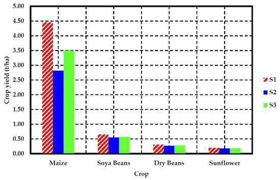We analyzed the effect of soil texture on crop yield under the current climatic conditions (1976–2005). Simulated results of crop yield (maize soya beans, dry beans, and sunflower) were higher in sandy loam and sandy clay loam, compared to loam sand, which is ascribed to high water retention in sandy loam and sandy clay loam soil. The grain yield in sandy loam and sandy clay loam was 5.6 t/ha and 4.5 t/ha respectively, as presented in Figure 6. Similarly, a study by Jalota et al. [46] found an increased grain yield of maize and wheat in sandy loam soil which the study attributed to the high water holding capacity of the soil. In our current study, it is evident that soil with low water retention capacity will have larger percolation loss which would increase the amount of water required for crop production. Adapting to this issue will require farmers to irrigate more often, particularly during periods of limited rainfall. However, this situation can be rectified through the application of organic matter to increase the density of the soil as suggested by Jalota et al. [46].