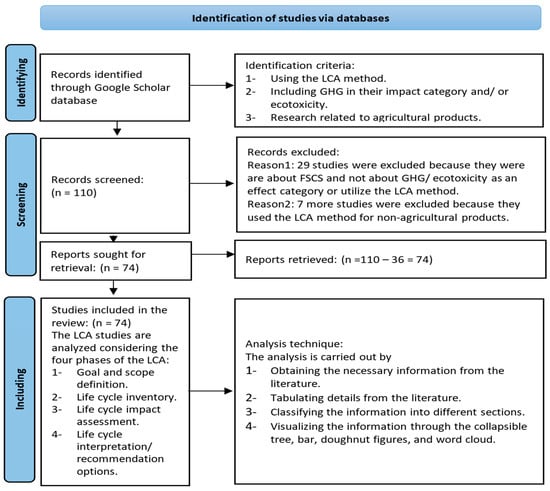 Furthermore, seven more were excluded because they used the LCA method for non-agricultural products. Accordingly, we ended up with 74 articles after applying the selection criteria. Figure 1 shows the steps used throughout the review and the inclusion criteria for the literature.