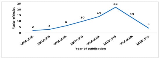 The characteristics of publications during 1998–2021 are displayed in Figure 2 to obtain an overview of LCA research. The number of publications per year has increased steadily since 2008, following development of the ISO standard.