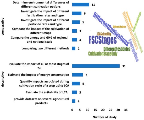 As indicated in the literature, LCA studies can be partitioned into two major categories: descriptive and comparative. Descriptions aim to recognize the natural load of a chosen framework, while comparisons aim to differentiate between two frameworks. Among the discussed papers, 48 were descriptive, while 30 were comparative. As noted, the most common aim was to assess agricultural production, cultivation, processing, packaging, transport, and emission at all production stages to recognize the vast issues and to propose reasonable alternatives that decrease the environmental effects (Figure 5). The purpose of this review was to better understand how to use LCA to evaluate the environmental impact of agricultural production. The least common goal was to compare LCA to other methods, which may be due to the difficulty of making a fair comparison in terms of method performance.