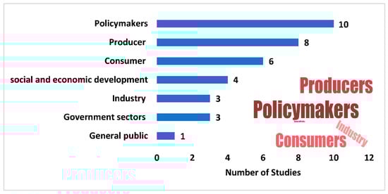 The target audience defines who undertakes or commissions an LCA and for whom. It is critical to understand who will use the LCA results to provide them with helpful information. The majority of articles have multiple target audiences (TAs). Politicians working on climate change, decision-makers, and policymakers on global warming potential (GWP) footprints related to food and common agricultural policy (CAP) were the most common TAs, with 10 studies. Additionally, several studies targeted government sectors such as food sector policymakers, the country’s agriculture sector, and the fruit and vegetable sector. Following that, the producers, namely, the farmers and the producing industry, were targeted in eight studies, six of which provided information to the consumer on a local and international scale (see Figure 6). People working on social and economic development, such as government policymakers for sustainable consumption and production, future ecolabeling programs, and those working to improve the environmental and financial sustainability of existing agricultural systems, were also targeted. Another target audience was represented by the Florida food, agri-food, and citrus industries. As shown in Figure 6, only 35 of the 74 research articles analyzed clearly stated their target audience. The frequency of target audiences is also displayed as a word cloud for a rapid overview.